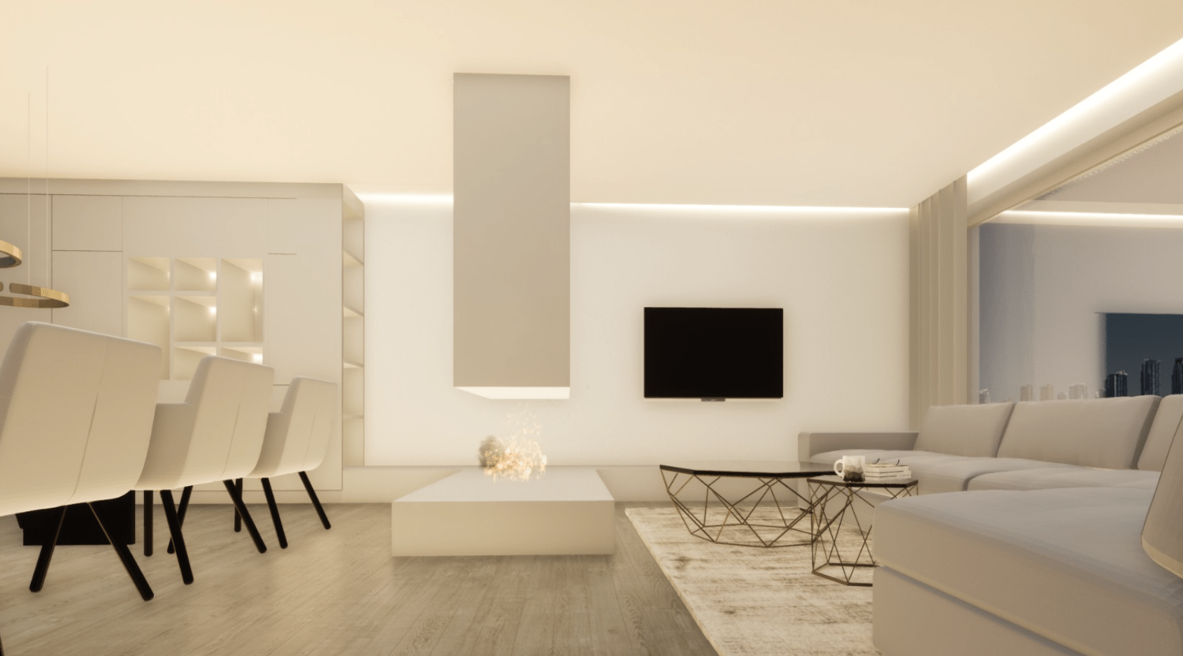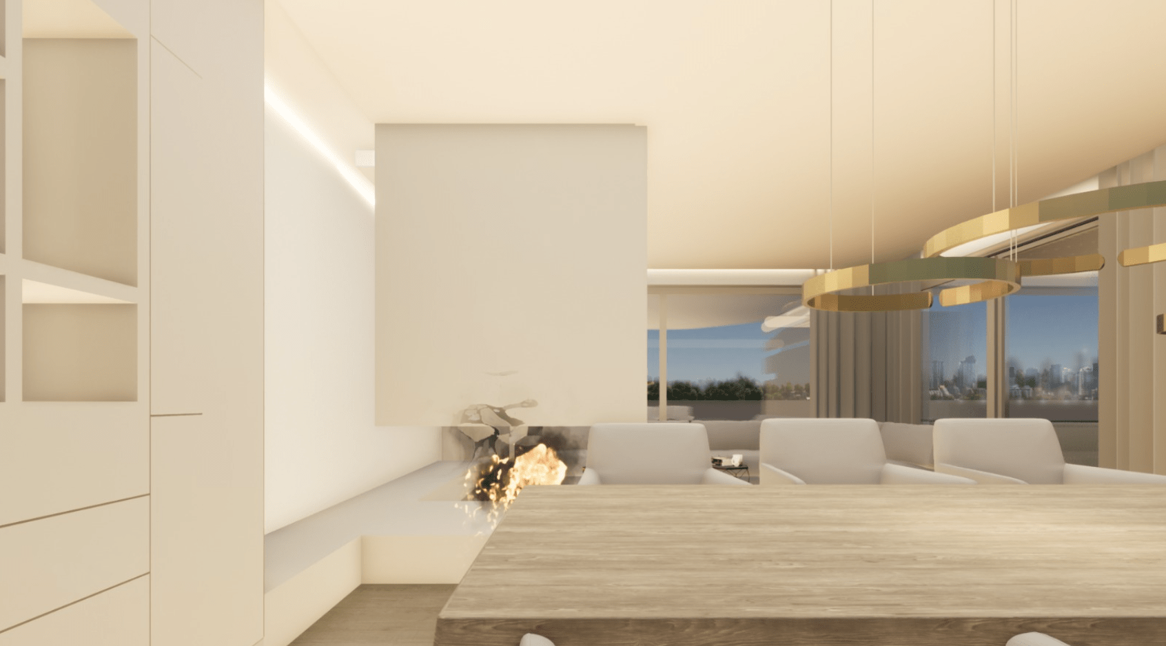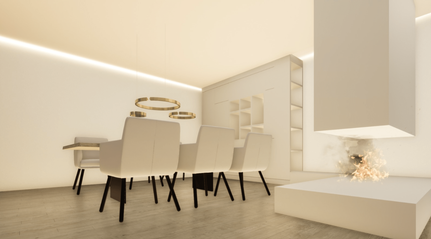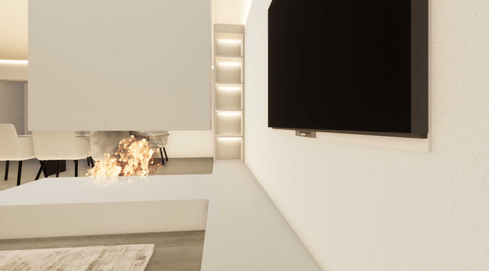 Planung und Visualisierung von Einbauschränken und Kamin in einem EFH in Tübingen. Hier ergeben sich zusammen mit den Bodenbelägen eine sanfte, aufeinander abgestimmte Farbigkeit. Akzente setzen hier die raffinierten Einbauten und der geplante Ethanol Kamin. Durch das geplante indirekte Licht hinter der Deckenabhängung entsteht eine sehr schöne Atmosphäre im Raum. Ein Ambiente zum Wohlfühlen.